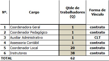 A equipe responsável pela execução do projeto, remunerada com recursos da parceria, é composta por Instrutores (Profissionais e Sociais), Monitores, Coordenadores Pedagógicos e Técnicos Administrativos.