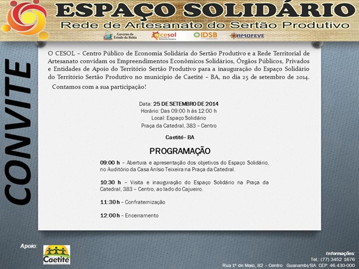 O Cesol – Centro Público de Economia Solidária do Sertão Produtivo e a Rede Territorial de Artesanato convidam os Empreendimentos Econômicos Solidários, órgãos públicos, privados e entidades de apoio para a inauguração do Espaço Solidário do Território Sertão Produtivo, em Caetité, que acontecerá na próxima quinta-feira (25 de setembro), às 9h.