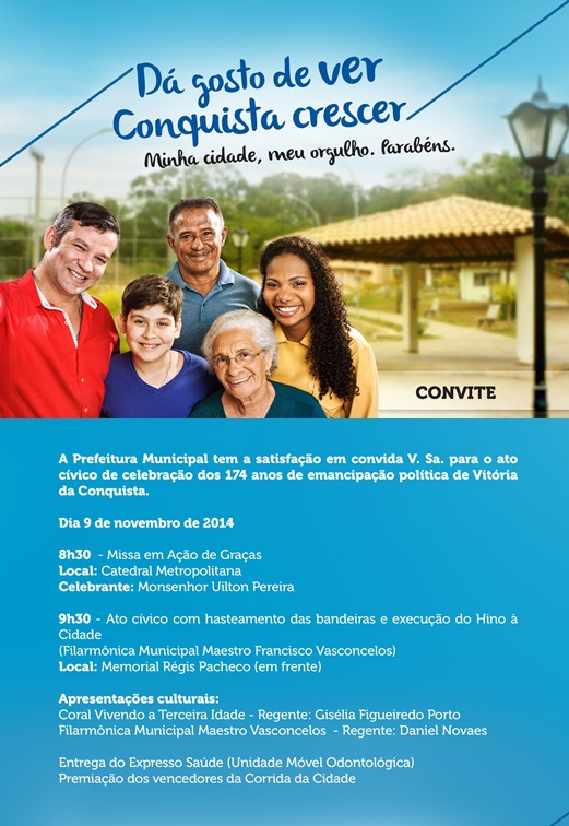 Neste domingo (09) Vitória da Conquista completa 174 anos de emancipação política. Com uma programação diversificada, a Prefeitura municipal promete muitas atividades para o aniversário da cidade. Missa, ato cívico e hasteamento da bandeira, com participação da Filarmônica Maestro Vasconcelos e o coral do Programa Vivendo a Terceira Idade.