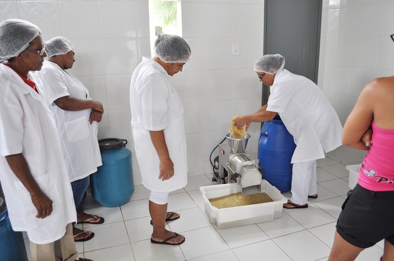 Reforçadas com um café delicioso, e com as caldeiras aquecidas, realizaram juntas a análise da qualidade da pré-polpa, observando o aspecto das colônias de bactérias do vasilhame; a despolpa do umbu, na máquina despolpadeira; e logo após, o passo-a-passo para a produção do doce e geleia de umbu: quantidades, qualidade, ponto, tempo, embalagens e rotulagem. Durante todo o processo, a troca de informações foi enorme: "o mais importante desse momento pra gente é a troca de experiências. A gente não está aqui só para ensinar, até porque não tem muita novidade para elas, que já produzem doces e geleias, mas também para aprender com elas", comenta dona Dice. E completou: "a maior novidade para elas é sobre o funcionamento do maquinário, e sobre os vasilhames onde guardamos e vendemos as geleias e doces. São coisas importantes que vamos ensinar".