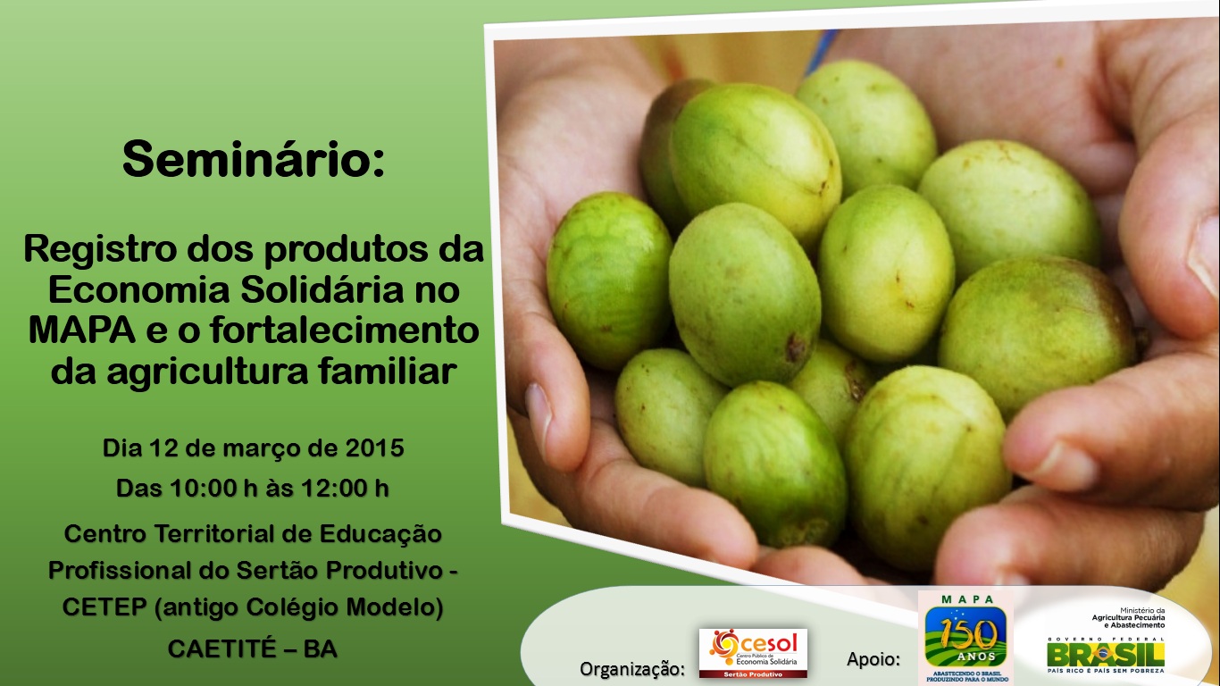 O Centro Público de Economia Solidária - CESOL Sertão Produtivo promove, no próximo dia 12 de março, um Seminário aberto na cidade de Caetité, no Centro Territorial de Educação Profissional do Sertão Produtivo - CETEP (antigo Colégio Modelo) das 10 às 12h.
