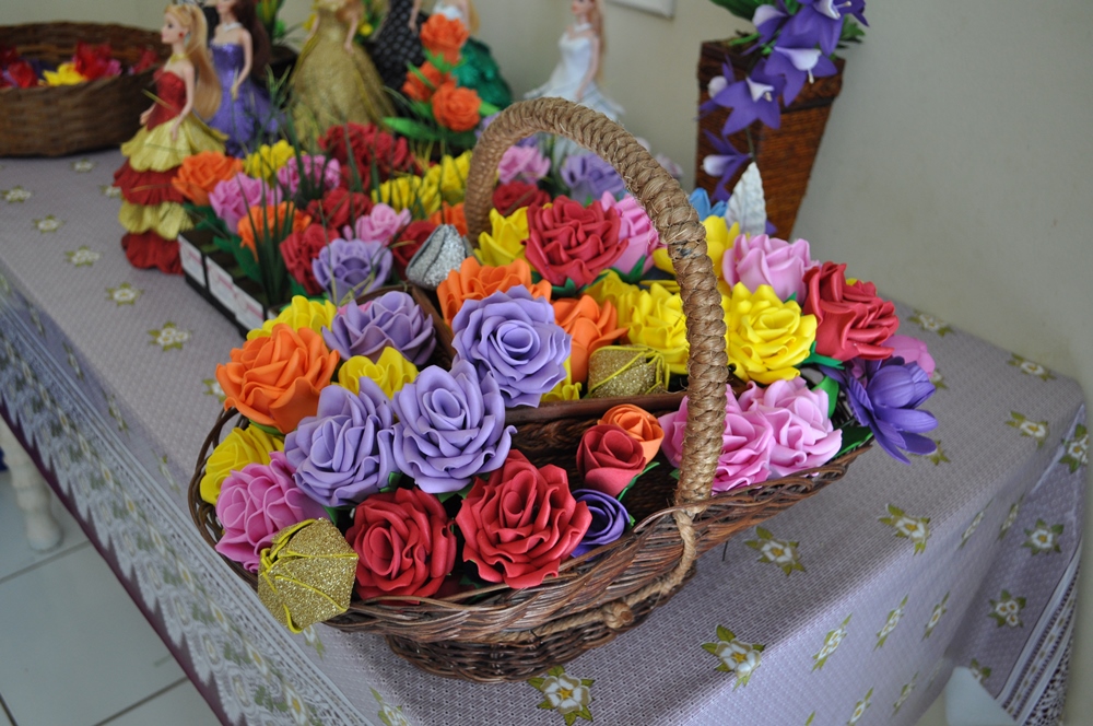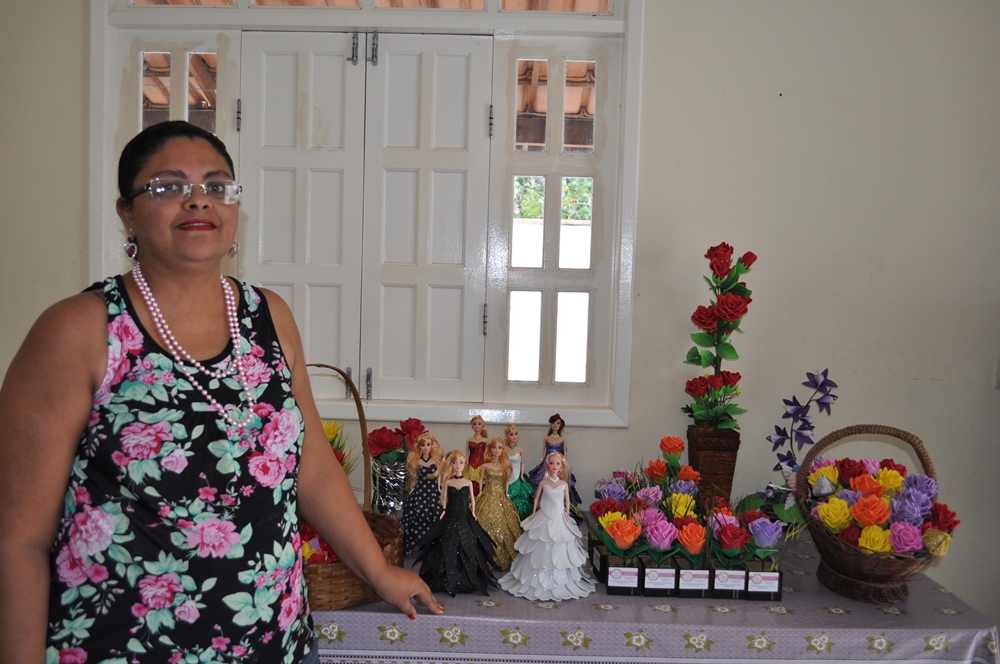 "Tive uma transformação de vida quando comecei a trabalhar com artesanato. Fiz dois cursos ano passado da Suflores, em que pude aprender a trabalhar com a espuma (EVA), fazendo flores ornamentais. Como estava sem uma ocupação na época, as flores vieram para mudar a minha vida. No início, foi difícil vender, montei uma barraquinha fixa na praça, mas não estava vendendo. Foi quando conheci o CESOL, na I Feira Territorial de Economia Solidária que aconteceu em outuro em Guanambi".
