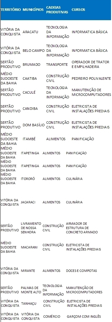 Os cursos oferecidos são baseados no potencial de cada município, veja abaixo a lista de cursos e municípios que ficarão sob responsabilidade do IDSB: