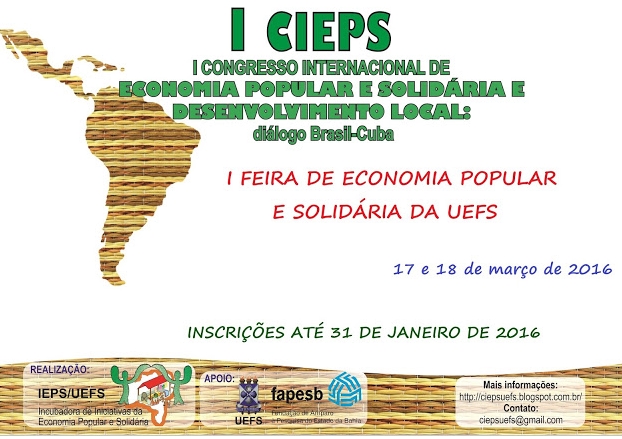 Acontecerá entre os dias 16 e 18 de março, no campus Central da Universidade Estadual de Feira de Santana (UESFS), o I Congresso Internacional de Economia Popular e Solidária e Desenvolvimento Local: diálogo Brasil-Cuba (I CIEPS). O evento pretende proporcionar o encontro entre as diferentes visões acerca dos temas propostos sobre Economia Solidária, privilegiando tanto o olhar acadêmico quanto os saberes e experiências populares. As atividades serão delineadas a partir de grupos de trabalho selecionados para apresentação tanto de relatos de experiências de trabalho cooperado, ou de sua organização, realizados por grupos de trabalhadores ou por entidades de fomento e apoio de tais iniciativas, quanto resultados de pesquisa ou extensão produzidos dentro dos padrões acadêmicos.