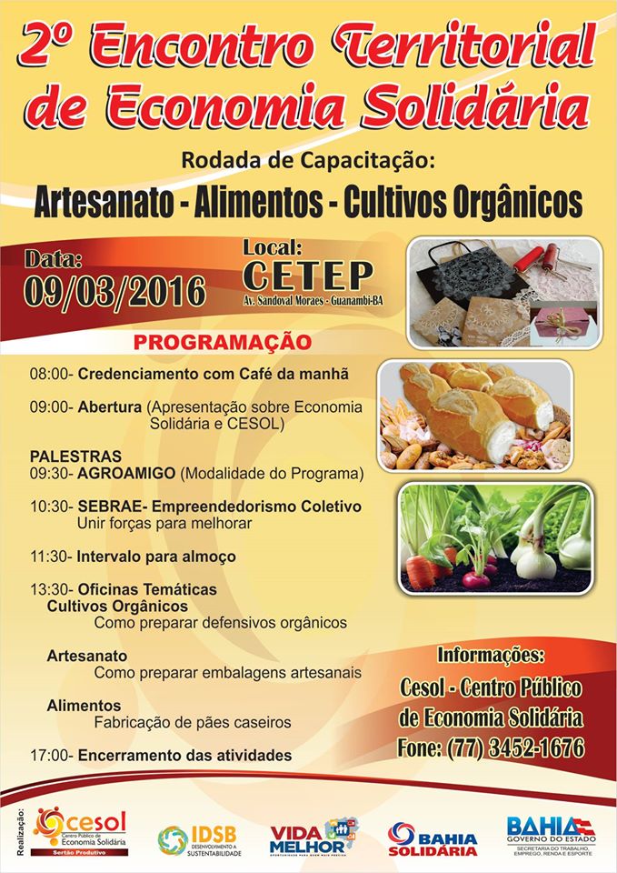 O Centro Público de Economia Solidária (CESOL) Sertão Produtivo realiza no dia 09 de março, a partir das 8h, no CETEP (Guanambi), o 2º Encontro Territorial de Economia Solidária.