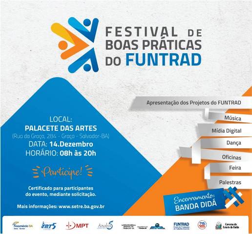 A Secretaria do Trabalho, Emprego, Renda e Esporte (Setre) realiza, nesta sexta-feira, dia 14, o I Festival de Boas Práticas do Fundo de Promoção do Trabalho Decente (Funtrad). O evento acontece das 8h às 20h, no Palacete das Artes, localizado no bairro da Graça, em Salvador.