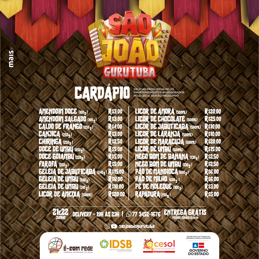 Entre as delícias que os empreendimentos da economia solidária têm preparado estão: canjica, amendoim, farofa, doces, licores e muitas coisas boas que não podem faltar em uma tradicional e animada festa junina. Os pedidos poderão ser feitos através do WhatsApp, 3452 1676, no horário das 19h às 23h.
