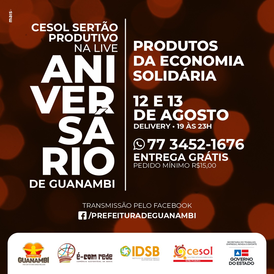 O Centro Público de Economia Solidária Território Sertão Produtivo participará nos dias 12 e 13 de agosto de live cultural em comemoração ao aniversário de 101 anos de emancipação política do município de Guanambi. O evento virtual é uma realização da Secretaria de Cultura, Esporte e Lazer, da Prefeitura Municipal de Guanambi.