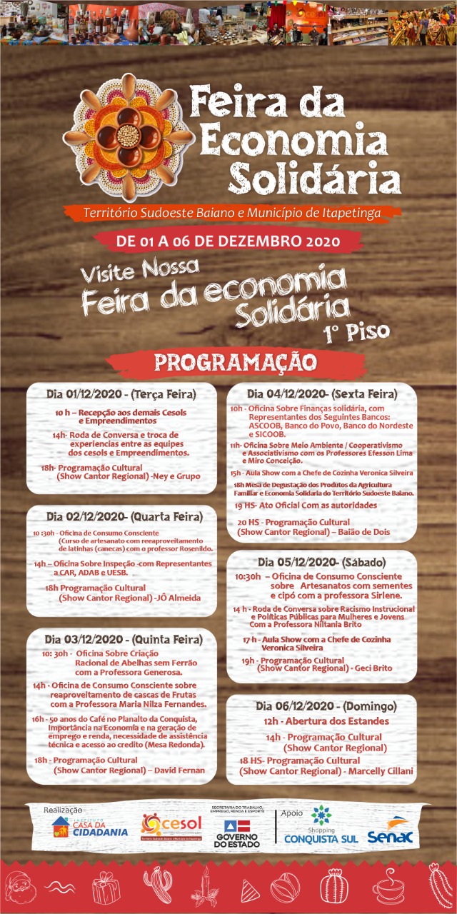 O Centro Público de Economia Solidária (Cesol) Sertão Produtivo, gerido pelo Instituto de Desenvolvimento Sustentável Baiano (IDSB), participa da Feira de Economia Solidária a convite do Cesol Sudoeste Baiano e Município de Itapetinga, e do Instituto Casa da Cidadania. A feira acontece de 1 a 6 de dezembro no Shopping Conquista Sul, 1° piso, no município de Vitória da Conquista.