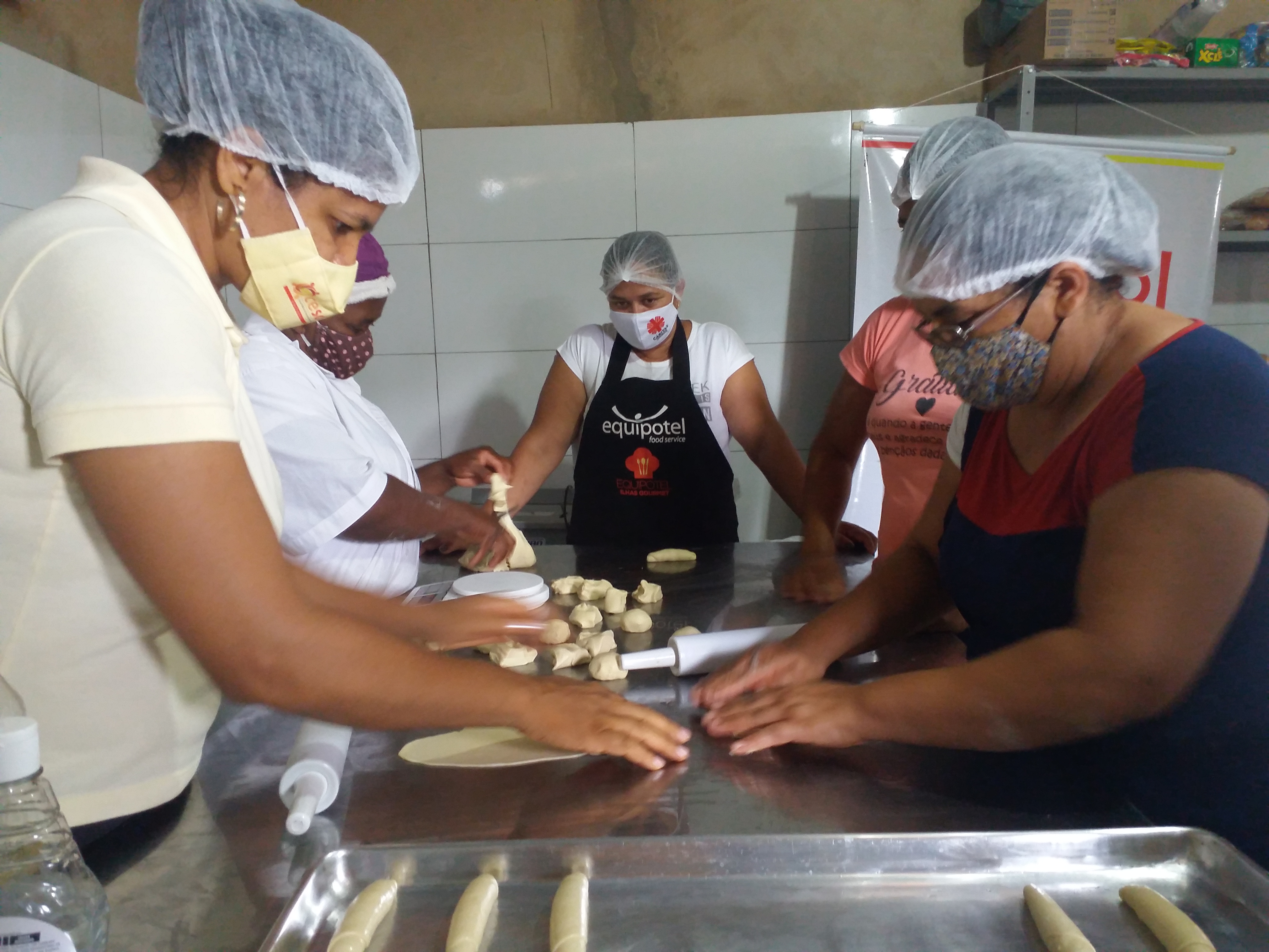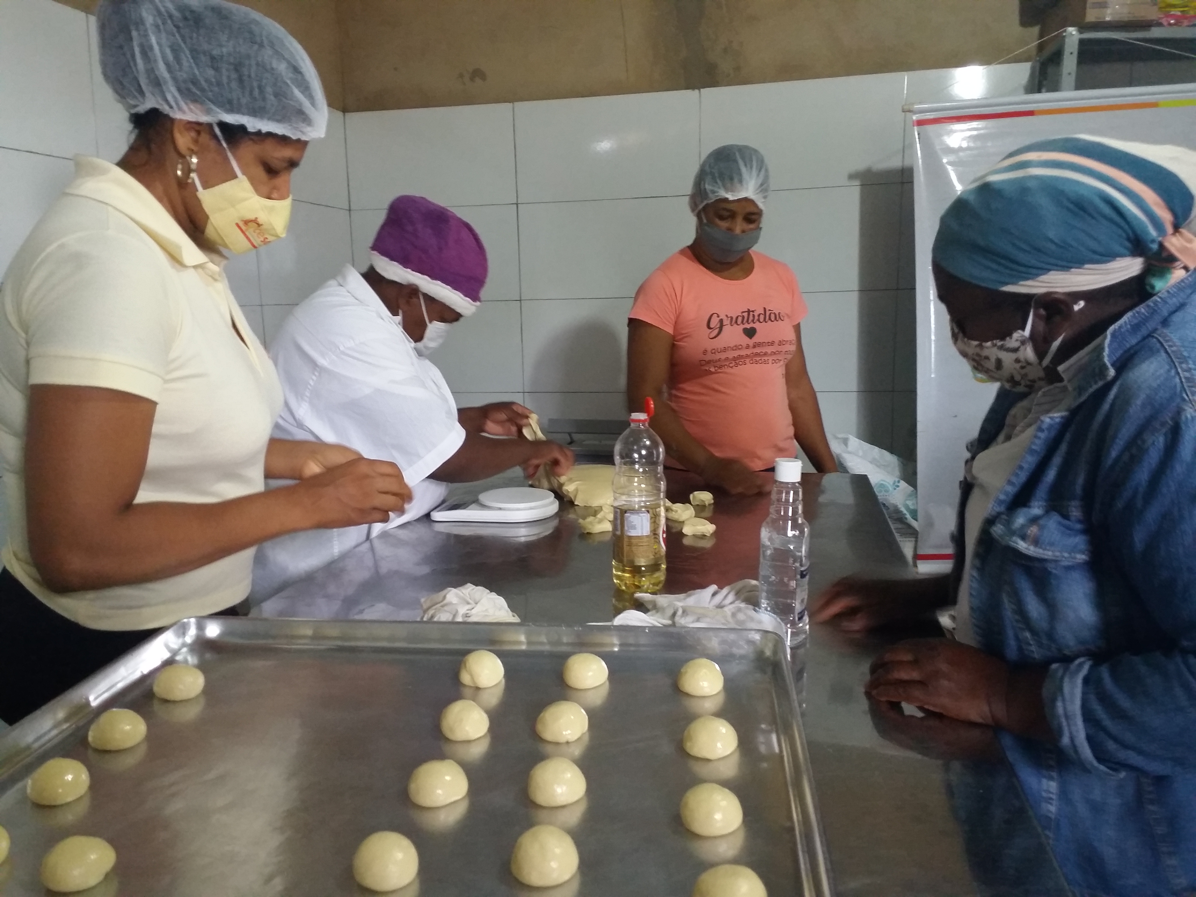 Não é novidade que o grupo se articula muito bem para desenvolvimento do trabalho, mas desta vez elas deram aula em cooperação ao compartilhar os saberes sobre a produção dos pães de sal e doce com a Luciene Oliveira, que é participante do EES Juntos Somos Mais, na zona rural de Poções, município de Igaporã.