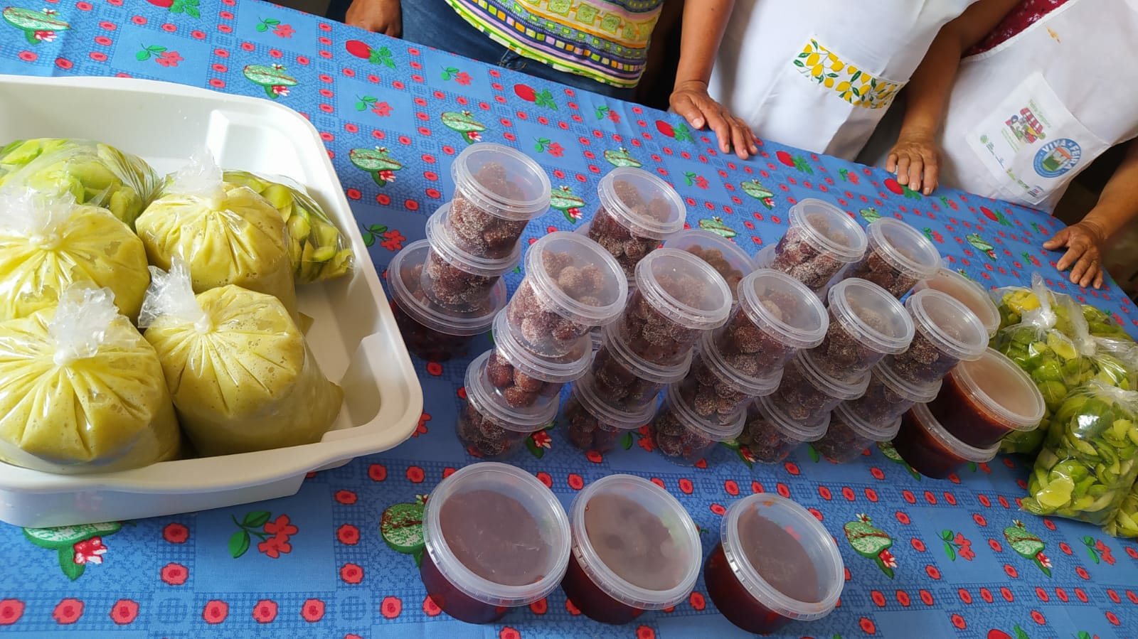 Foram ensinadas as receitas do doce nego bom, de geleias e polpas, feitas a partir dos frutos do umbu, acerola e banana. Aldenita Alves Duca integra um grupo de mulheres que produzem os produtos Meuryluta, ela foi responsável por conduzir a Oficina, compartilhando as receitas e as experiências na cozinha.