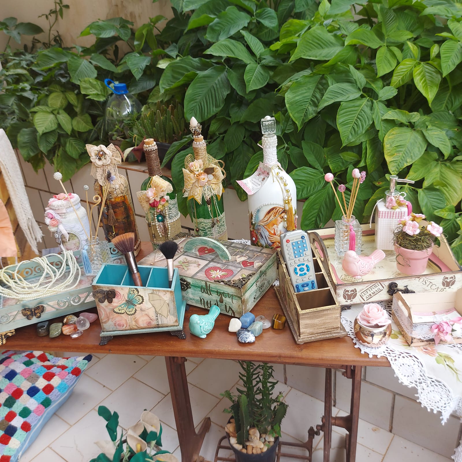 Visitar a casa da Djanira Nascimento é encontrar criatividade por todos os cantos, coisa de artesã e do Mimos da Filó. Na verdade, de três artesãs que se unem há cinco anos para falar e fazer arte, criando lindos itens decorativos. Djanira Nascimento, também é Assistente Social e produz artesanatos a partir da madeira, pedrarias e reciclados, já compartilhou saberes com grupos de crianças e idosos, ela vê na produção da arte uma maneira terapêutica de promover saúde e bem-estar.