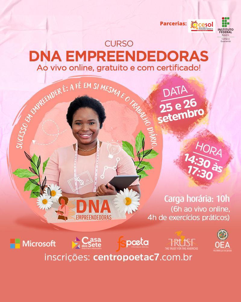 O curso DNA Empreendedoras é uma boa oportunidade para mulheres do Sertão Produtivo que empreendem e desejam desenvolver mais habilidades, principalmente nos meios digitais. As aulas acontecerão nos dias 25 e 26 de setembro, das 14h30 às 17h30, através de videoconferência na plataforma Teams. O curso é gratuito e com certificação.