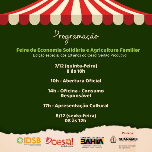 O Centro Público de Economia Solidária (Cesol) Sertão Produtivo, gerido pelo Instituto de Desenvolvimento Sustentável Baiano (IDSB), através da Secretaria do Trabalho, Emprego, Renda e Esporte (Setre), do Governo do Estado, em parceria com a Secretaria Municipal de Agricultura de Guanambi vão promover nos dias 7 e 8 de dezembro a Feira da Economia Solidária e Agricultura Familiar – Edição Especial 10 anos do Cesol Sertão Produtivo. O evento acontecerá na Praça Gercino Coelho, em Guanambi.